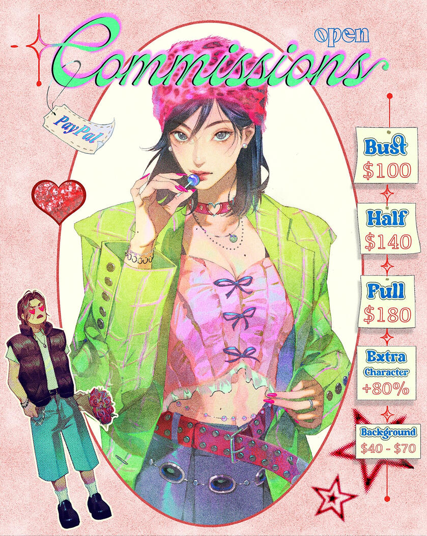 ❤︎ Please read thoroughly ❤︎⟡ Payment upfront via PayPal⟡ To place an order, contact me through: [email protected]. Do include your Twitter/Instagram handle, i'll message you a confirmation regarding the commission⟡ I can only respond to detailed information, so please provide your social media handle, brief summary of your idea/description, and image references (even a simple stickman doodle will help me a lot, pretty much prefer this way) CLEARLY in 1 file/PDF⟡ I'll charge when i start on your commission⟡ To finalized a slot for a commission, please settle the payment within 48 hours. If payment isn't received within the time frame above, the commission will be moved or considered cancelled⟡ Once i start the sketch there will be no refunds⟡ It takes 4-6 weeks for me to finish a commission, rush fee will be added for a tight deadline⟡ Complexity and major revisions may increase the price⟡ I don't do NSFW, gore (soft gore is ok), mecha⟡ Personal use (non-profit only), do not use for commercial purposes. Commercial commisions will be discussed further⟡ Do not claim the work as your own. Reselling/redistribution, NFT usage and AI purposes are STRICTLY forbidden⟡ I reserve the right to refuse any commission⟡ I'm allowed to post the finished piece on my account (feel free to let me know if you don't want it to be posted). If you want to post the final piece do tag/credit me⟡ Let's be respectful in the process ^^